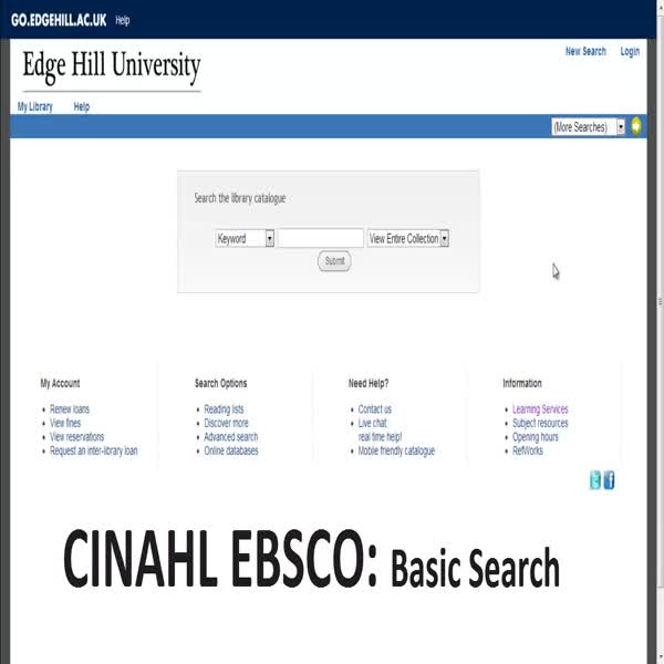 A step-by-step guide to conducting a basic literature search using CINAHL via Ebsco. Useful for Undergraduates and beginners. (Please note, for NHS staff access to the database is via My Athens and not via the Library catalogue).