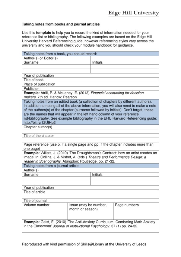 A template which may be useful for students who are new to taking and making notes from academic texts.