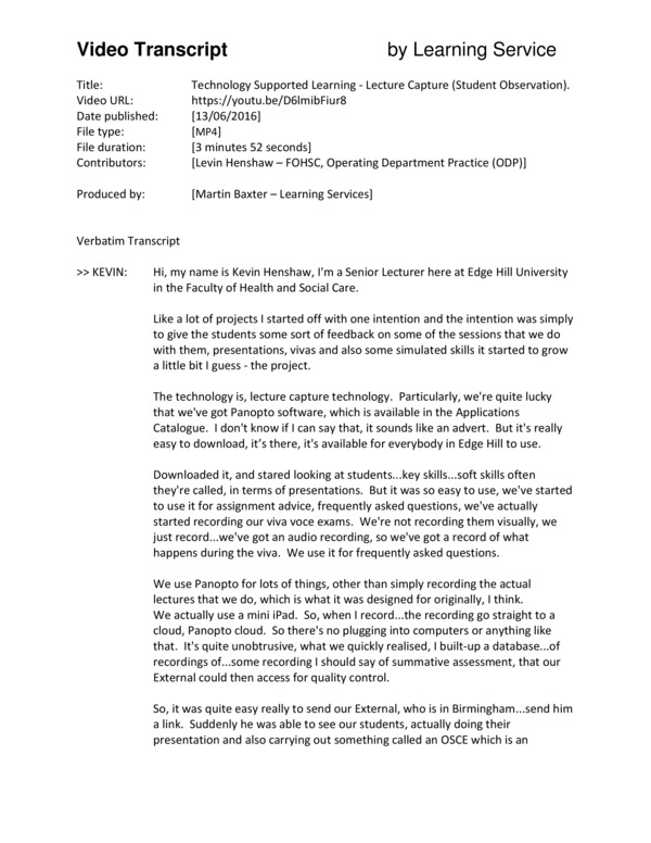 Video transcript, an alternative method of accessing the content of the following video recording: Technology Supported Learning - Lecture Capture (Student Observation) - YouTube link: https://youtu.be/D6lmibFiur8