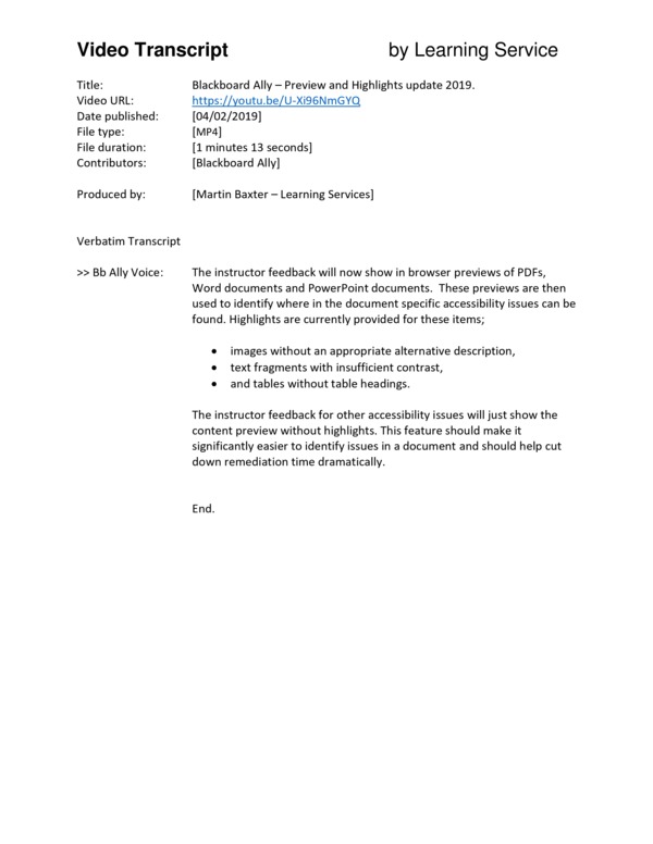 Video transcript, an alternative method of accessing the content of the following video recording: Blackboard Ally - Preview and Highlights update 2019 - YouTube link:https://youtu.be/U-Xi96NmGYQ