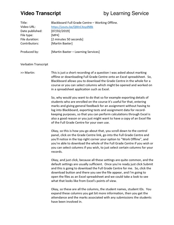 Video transcript, an alternative method of accessing the content of the following video recording: Blackboard Full Grade Centre – Working Offline - YouTube