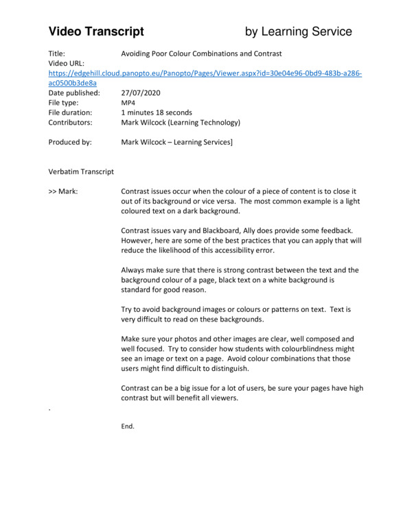 Transcript for a bite-sized video recording that explains the importance of good colour combinations for accessible content.