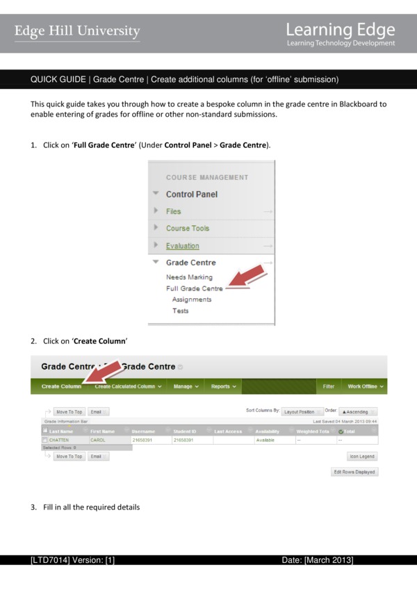 Presentation Slides for the 'Successfully managing online marking – A guide to using the Grade Centre in Blackboard' session. With an ever increasing use of Electronic Assignment Management (EAM) at Edge Hill through tools such as Turnitin, Assignment Handler, Blackboard Assignment and Blackboard Tests and also by inputting offline marks too (presentation, performance, artwork etc), it is increasingly vital that everyone is aware and confident of managing their part in this process.