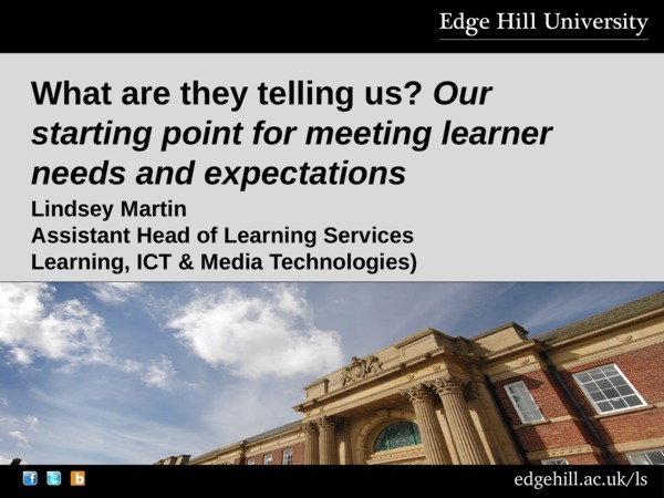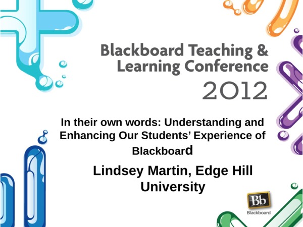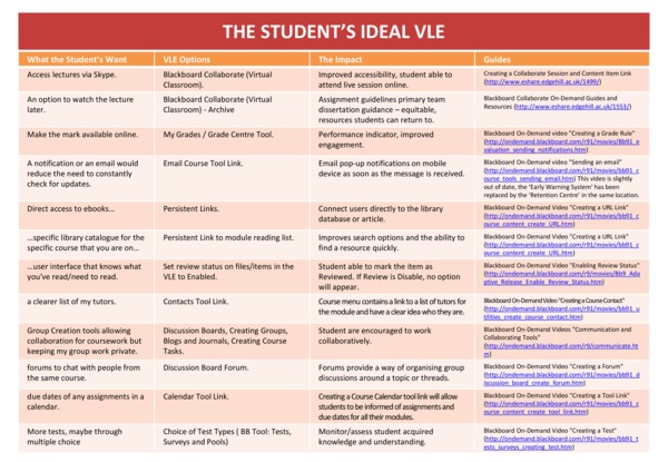 Presentation Materials for 'The Students' Ideal VLE' DDE Presentation. Learn more about what your students want from Learning Edge (Blackboard) and how you may be able to provide it for them. From an overview of student views informed by the Annual Student eLearning Survey, you will be able reflect on your current use of technology and how you may be able to enhance your practice in the future.